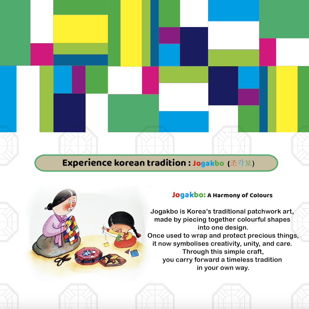 Jogakbo (조각보) is a traditional Korean patchwork art, created by joining small, colourful pieces into one harmonious design. Once used to wrap and protect precious items, Jogakbo has come to symbolise creativity, balance, and everyday beauty.