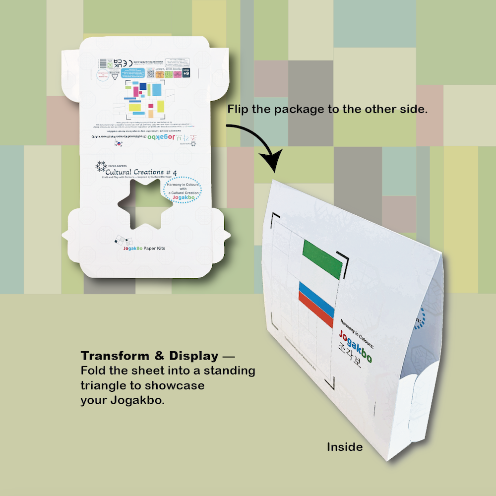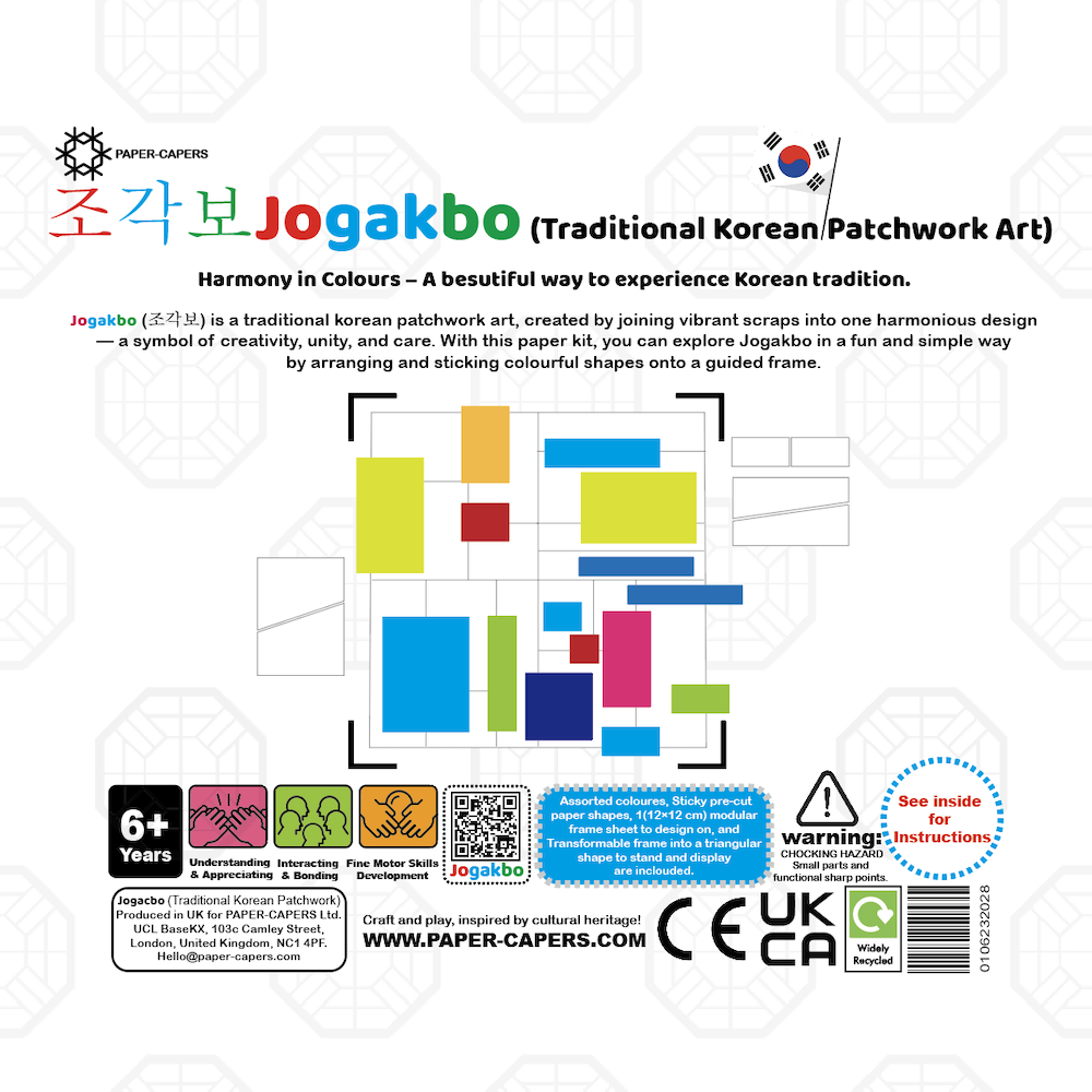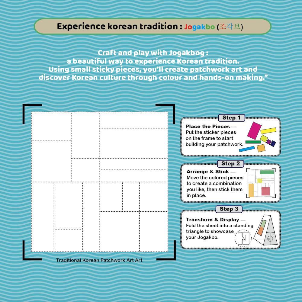 This kit includes everything you need to design and display your own Jogakbo creation. Suitable for ages 6 and up, it offers a hands-on cultural experience — simple, creative, and full of colour.