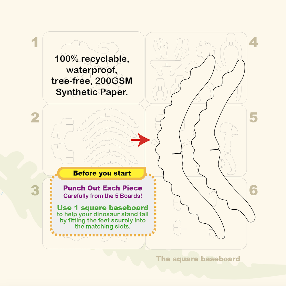 For ages 7 and up. Includes 6 square boards (15 × 12 cm) with 40 pre-cut pieces, plus a special QR code for extra digital content and step-by-step assembly instructions included in the pack. 100% recyclable, waterproof, tree-free, 200GSM Synthetic Paper.