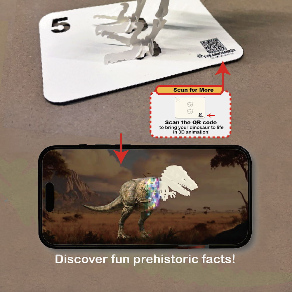 Scan the QR code inside each kit to unlock a short educational animation, filled with fascinating dino facts and dynamic visuals.